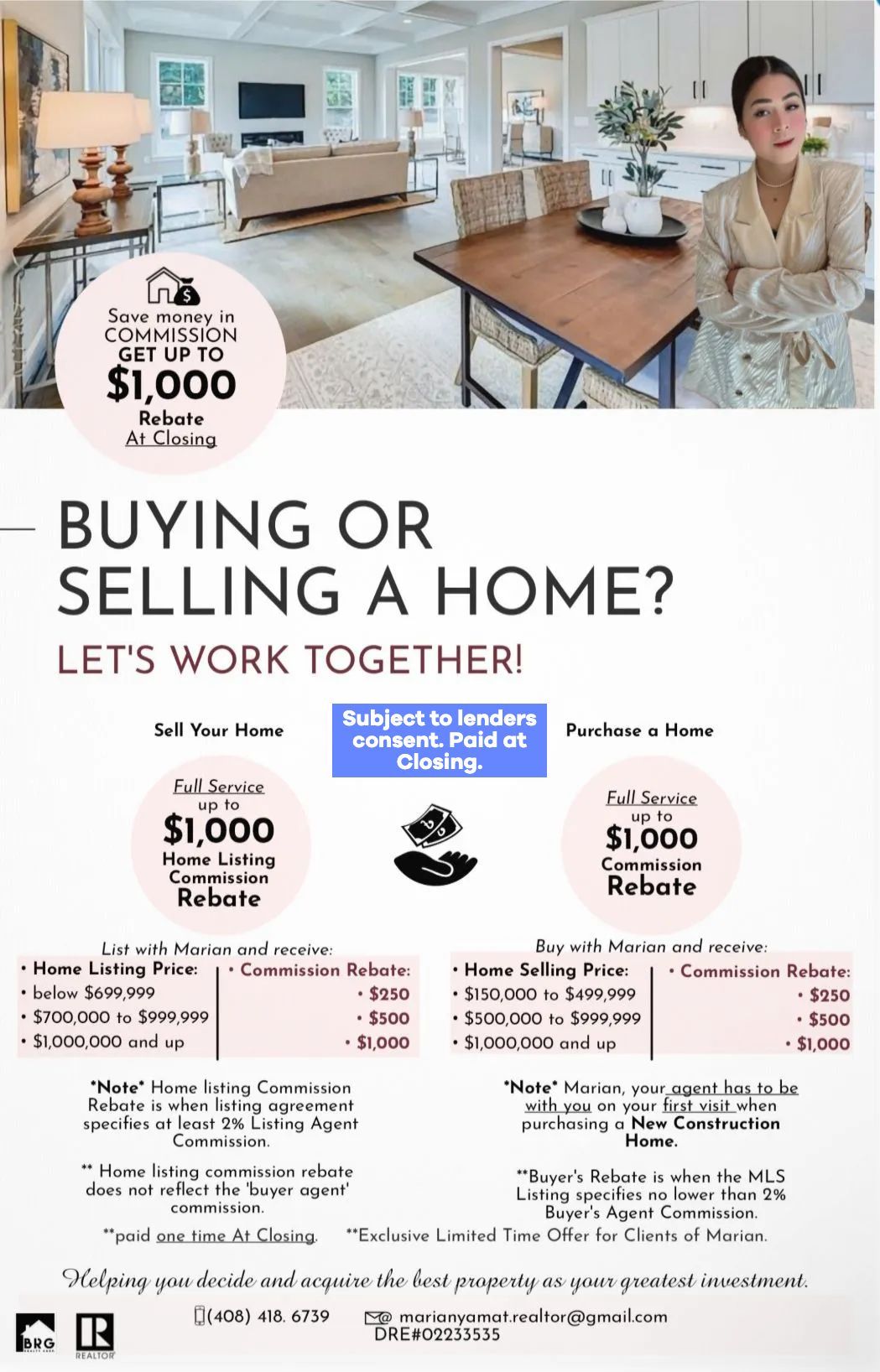 Her top-notch customer service and commitment to her clients is second-to-none. Get Commission Rebate when you work with Marian!